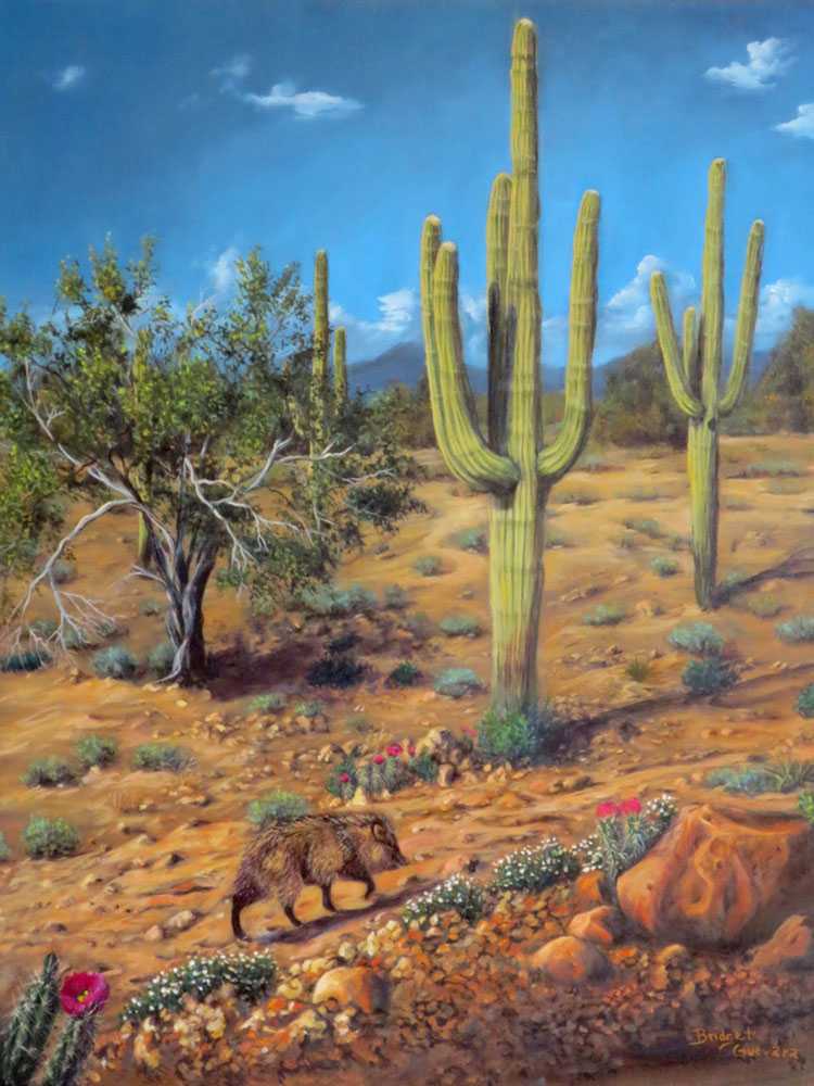 Bridget A. Guevara, is a self-taught artist hailing from Winslow, Arizona, who weaves intricate tales of nature through her oil paintings. Drawing inspiration from the rugged beauty of the Arizona high-desert, where she grew up and presently resides, as well as her love of animals, Bridget's canvases come alive with wildlife and vivid landscapes with intricate detail. Her brushstrokes capture the essence of nature, from sun-kissed mesas and endless skies, to close up details of cacti or flowers.